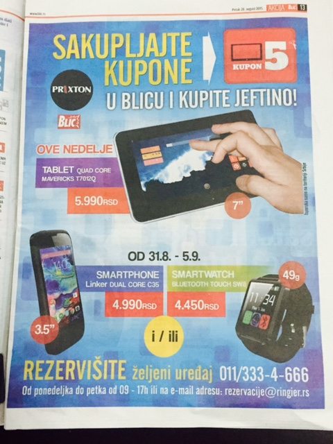 Pre desetak dana dnevne novine „Blic“ odlučile su da nagrade verno čitateljstvo, omogućivši mu da skoro pa za džabe pazari mobilni telefon, sat i tablet računar izvesnog španskog proizvođača koji se tek probija na tržištu. U toku je druga nedelja akcije, u kojoj je aktuelan tablet, a naredne valjda ide „pametan“ sat. Nije u pitanju nekakva nagradna igra u kojoj se srećni dobitnici izvlače iz bubnja, već bi ova sokoćala trebalo da dobiju svi koji ispune nekoliko prostih uslova. Kako Blic iz dana u dan objašnjava, potrebno je najpre kupiti novinu u kojoj je talon, a onda od ponedeljka do petka sakupljati i lepiti kupone sa rednim brojevima od jedan do pet. Zatim krajem nedelje, u naznačenom vremenskom terminu, treba okrenuti broj telefona njihove nadležne službe ili se prijaviti elektronskom poštom ostaviti podatke i čekati poštara  (ne elektronskog nego pravog iz neke kurirske službe). Ovi uređaji nisu besplatni, već vredni sakupljači kupona imaju mogućnost da ih kupe po promotivnoj ceni od 4.450 za sat, 4.990 za telefon i 5.990 za najskuplji tablet, koje plaćaju poštaru kada im donese robu, uz obavezu da pokažu talon sa svih pet nalepljenih kupona. I sirće je, kažu, slatko kad je džabe, a gde pa ne androidi po ceni jednog prosečnog ručka. Zato je naš čovek navalio da pasionirano kupuje Blic, secka i lepi, sve nadajući se poštaru, srećan što će za ništa da dobije nešto. A i da se edukuje. Evo, recimo, da sazna sa naslovnice da se idol ovdašnjeg polusveta Aca Lukas razvodi od supruge Sonje, zbog čega su oboje potišteni, evo se Cane već iselio iz zajedničkog stana a gospojin bivši muž sve to gleda sa strane i kao pravi džentlmen neće da se meša. Ili da napari oči golim manekenskim i pevačkim guzicama koje se „ludilo ekstra super“ provode po plažama, uglavnom da pročita i vidi ko je koga prevario, sa kim i zašto, koja je cena dostojanstva za ulazak u rijaliti i ko, na kraju, da prostite, koga onodi!