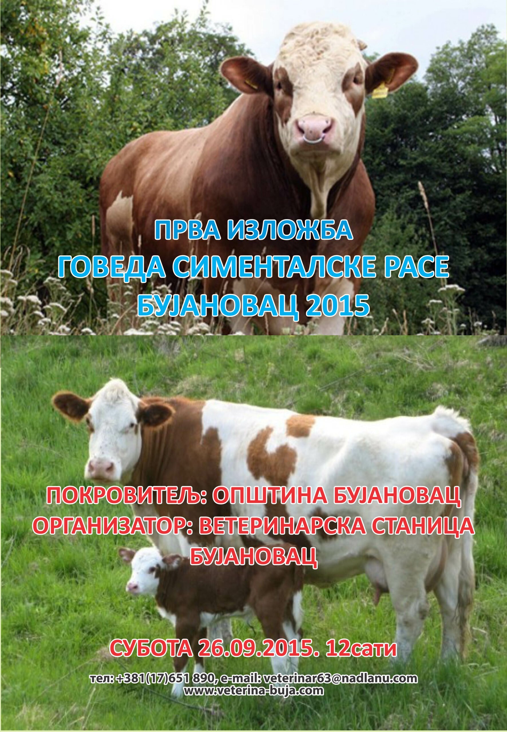 BUJANOVAC, 21. septembar 2015. (Bujanovačke) – Veterinarska stanica Bujanovac, jedna od najboljih u zemlji, pod pokroviteljstvom lokalne samouprave, organizuje Prvu izložbu goveda simentalske rase „Bujanovac 2015.“ Na fudbalskom stadionu u Levosoju u subotu 26.septembra sa početkom u 12 sati.