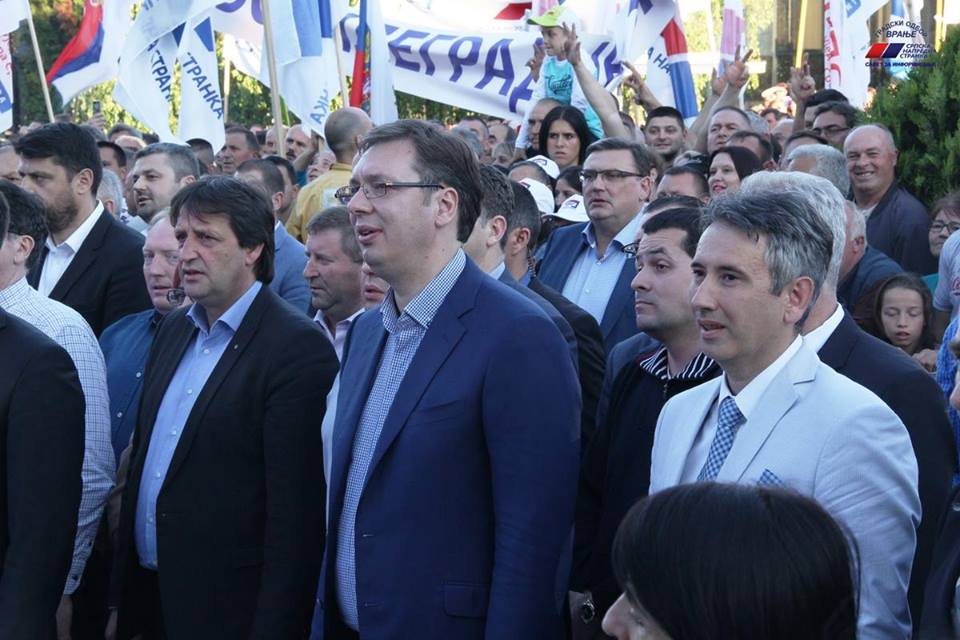 Osim Vranjanaca, među okupljenima je bilo i pristalica SNS iz ostalih gradova juga Srbije koji su u Vranje stigli u nekoliko desetina autobusa.