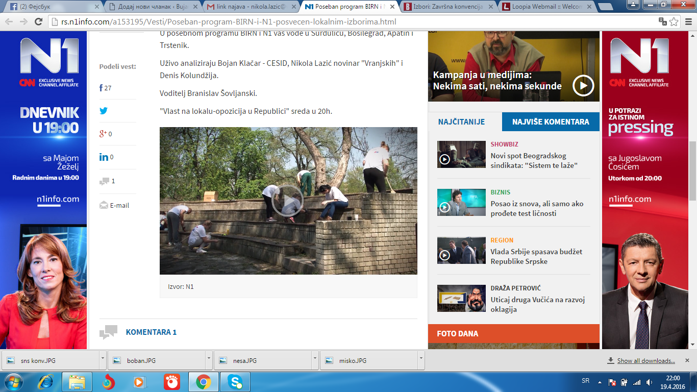 BUJANOVAC, BEOGRAD, 19. april 2016. – Nikola Lazić, osnivač portala Bujanovačke i urednik u nedeljniku Vranjske, biće jedan od gostiju u emisiji posvećenoj lokalnim izborima “Vlast na lokalu, opozicija u republici” na TV N1 u sredu od 20 sati.