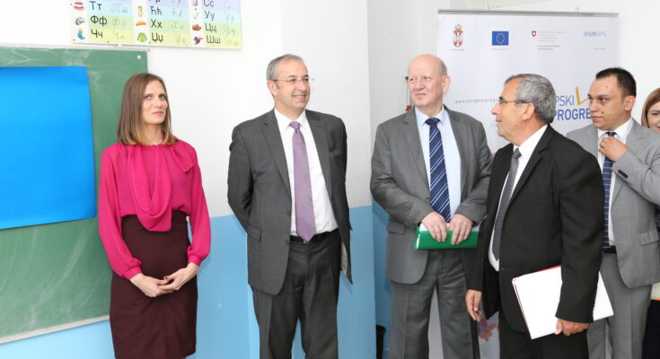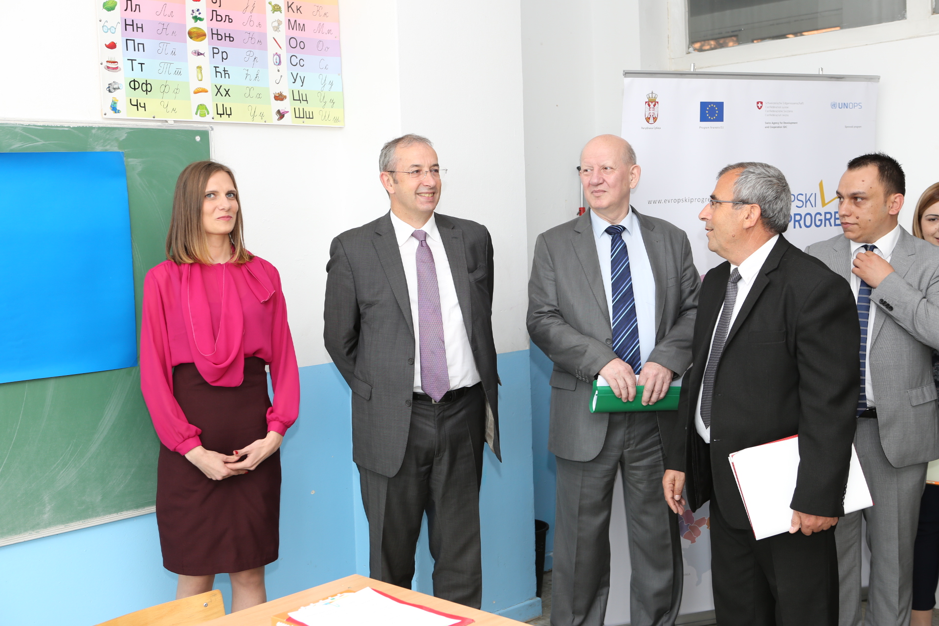 Bujanovac, 7. jun 2016. – Šef Delegacije Evropske unije u Srbiji, amabasador Majkl Davenport i predsednik Koordinacionog tela za opštine Preševo, Bujanovac i Medveđa, Zoran Stanković razgovarali su danas u Osnovnoj školi „Naim Frašeri” u Bujanovcu sa učenicima i učenicama iz albanske zajednice koji su učestvovali u projektu unapređenja znanja srpskog kao nematernjeg jezika. Projekat su finansijski podržale Evropska unija i Vlada Švajcarske preko razvojnog programa Evropski PROGRES u partnerstvu sa Koordinacionim telom za opštine Preševo, Bujanovac i Medveđa.