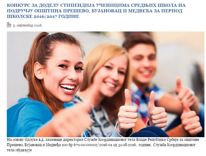 BEOGRAD, BUJANOVAC, 8. septembar 2016. – Služba Koordinacionog tela Vlade Republike Srbije za opštine Preševo, Bujanovac i Medveđa (KT) objavila je konkurs za dodelu stipendija učenicima srednjih škola za školsku 2016./17. godinu.