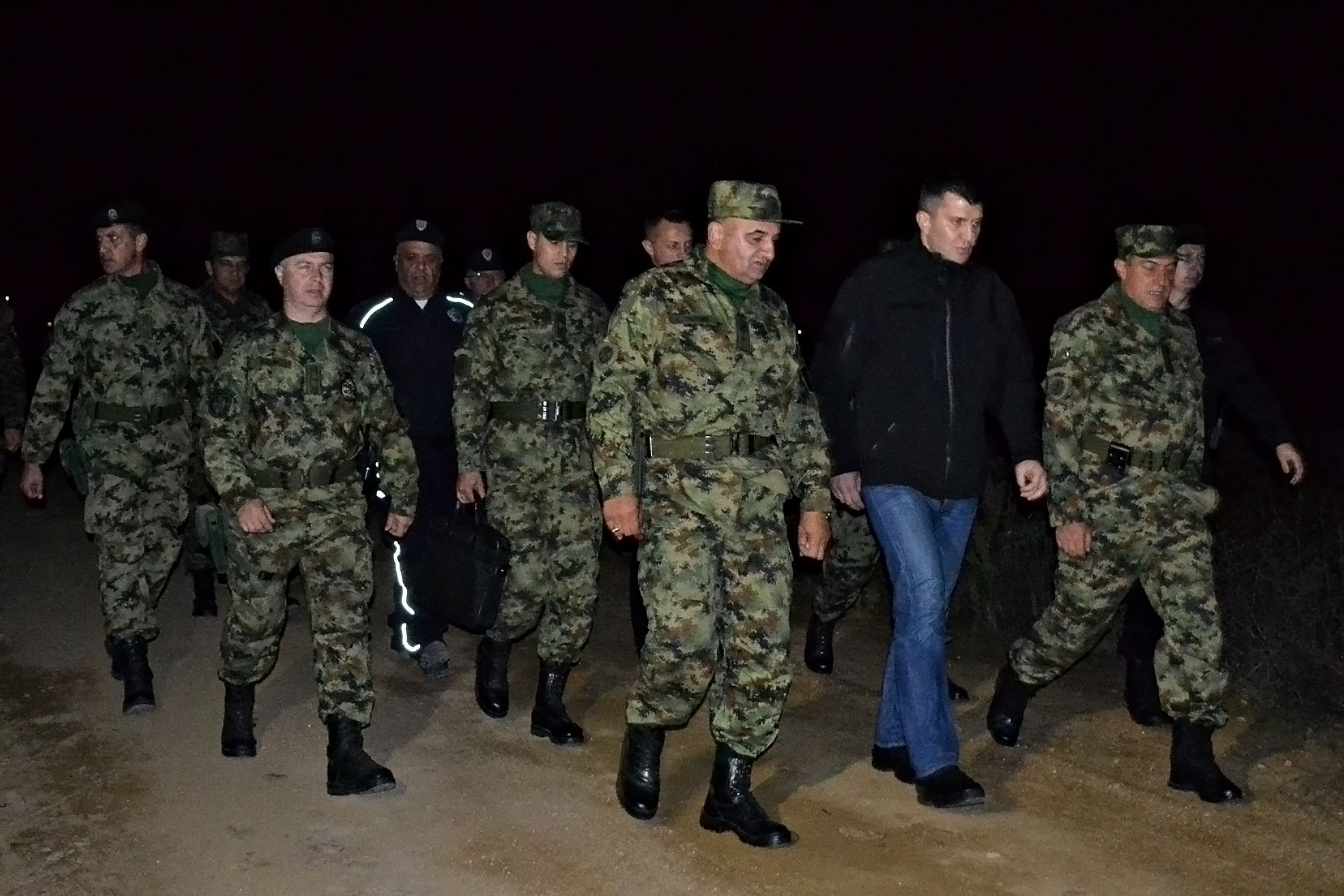 PREŠEVO, BUJANOVAC, 16. oktobar 2016.(Foto: MOD) – Ministar odbrane Zoran Đorđević i načelnik Generalštaba Vojske Srbije general Ljubiša Diković sinoć su obišli Zajedničke snage Vojske Srbije i MUP-a angažovane na obezbeđenju državne granice na Miratovačkom polju u blizini Preševa, saopštilo je Ministarstvo odbrane.