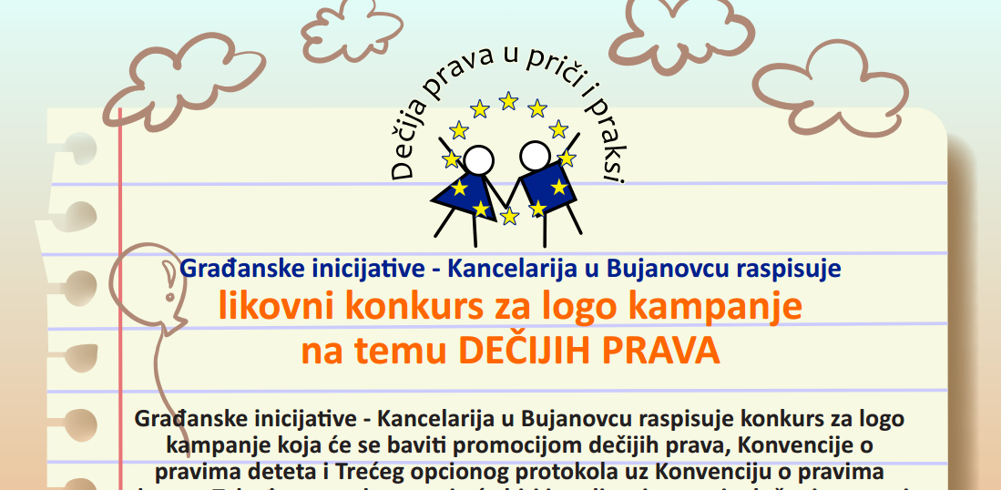BUJANOVAC, 19. oktobar 2016. – Udruženje Gradjanske Incijative raspisuje konkurs za logo kampanje koja će se baviti promocijom dečijih prava, Konvencije o pravima deteta i Trećeg opcionog protokola uz Konvenciju o pravima deteta. Takođe, tema kampanje će biti i podizanje svesti o kršenju prava i mehanizmima zaštite prava deteta.