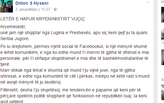 BUJANOVAC, 7. decembar 2016. – (foto FB)- Mladi Albanci Preševske doline zabrinuti su za svoju budućnost jer ovde zbog aktuelne državne politike ne vide svoju perspektivu – stoji između ostalog u otvorenom pismu koje je Drilon Hiseni iz Bujanovca poslao premijeru Aleksandru Vučiću.