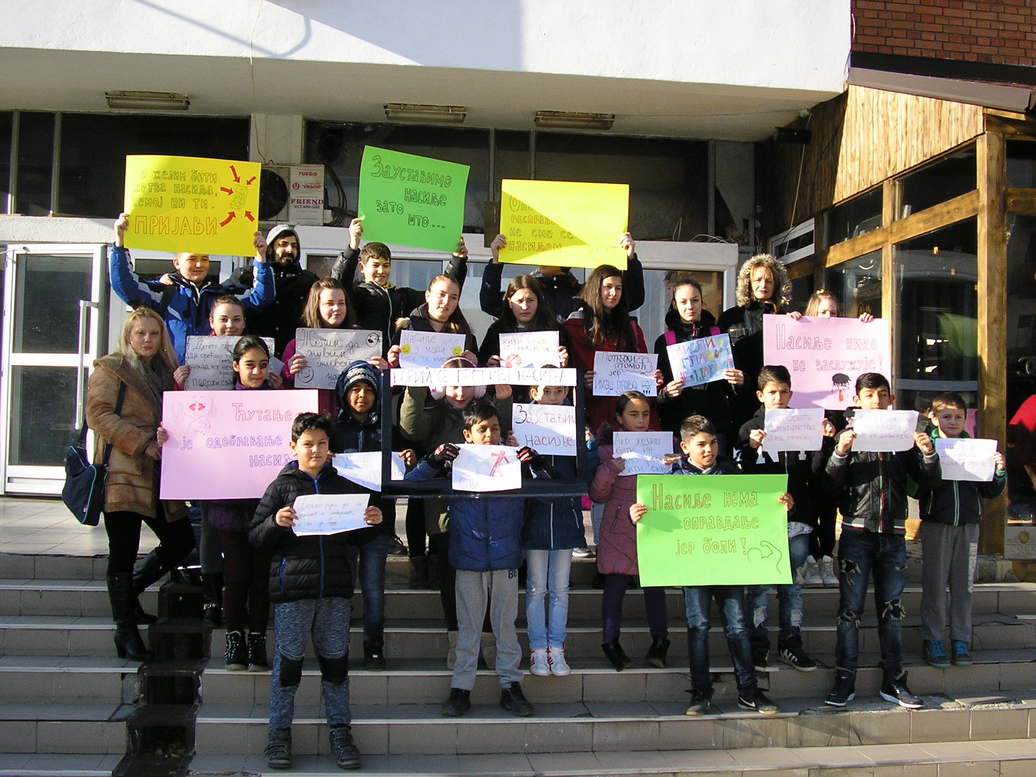 BUJANOVAC, 14. decembar 2016. – Učenici Osnovne škole “Branko Radičević” iz Bujanovca, članovi Đačkog parlamenta i Bujanovačkog društva učitelja (BUDU), noseći transparente sa ispisanim porukama različitog sadržaja, danas su ispred Doma kulture u Bujanovcu izrazili svoj stav prema nasilju.