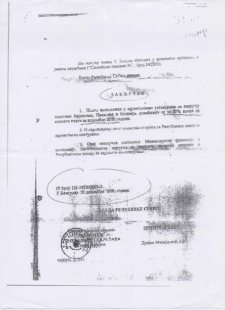 [quote]Ovom odlukom je poništen Zaključak Vlade Republike Srbije donet pre petnaest godina, kojim su plate zaposlenih u zdravstvenim ustanovama na području opština Preševo, Bujanovac i Medveđa povećane za 50 odsto[/quote]