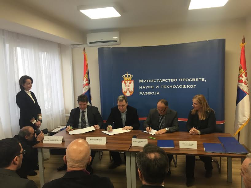 BEOGRAD, BUJANOVAC, 24. decembar 2016.– Ministar prosvete, nauke i tehnološkog Mladen Šarčević, Dragoljub Kojičić, direktor Zavoda za udžbenike i predstavnici Nacionalnih saveta bošnjačke, bugarske, mađarske, rumunske, rusinske, slovačke i hrvatske nacionalne manjine danas su potpisali anekse Memoranduma o saradnji u oblasti izdavanja udžbenika na jeziku i pismu nacionalne manjine.