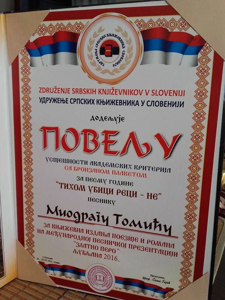 [quote]Na Međunarodnom konkursu u Ljubljani 2015. godine dobio je „Povelju akademskih kriterija“ sa bronzanom plaketom, koju mu je dodelilo Udruženja srpskih književnika Slovenije[/quote]