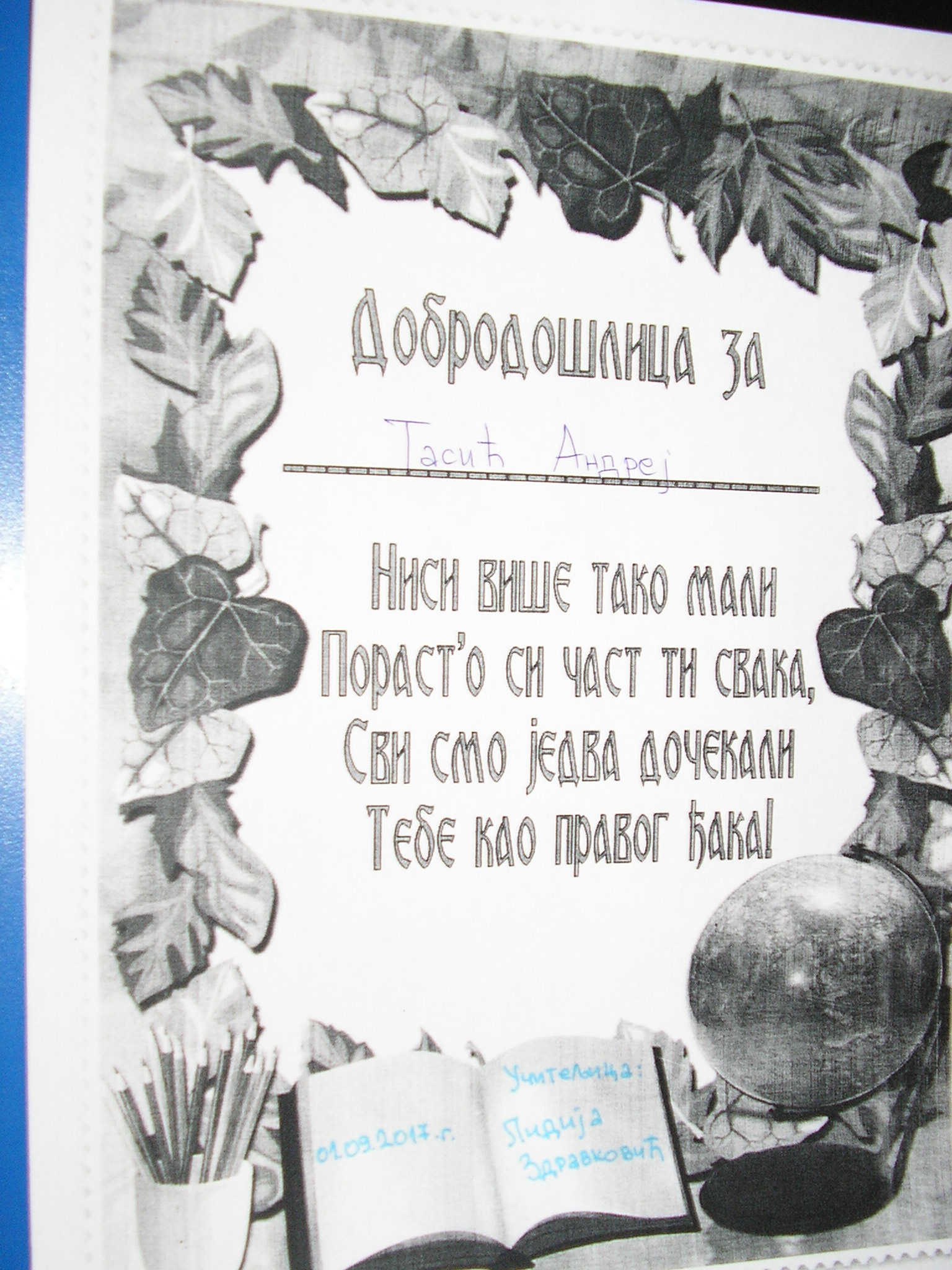 [quote]Nakon upoznavanja uručene su im svečane dobrodošlice na kojima piše: „Nisi više tako mali, porast’o si čast ti svaka, svi smo jedva dočekali, tebe kao pravog đaka!“[/quote]