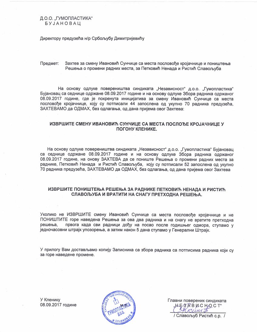 BUJANOVAC, KLENIKE, 28. septembar 2017. – Zbor radnika i Povereništvo sindikata Nezavisnost „Gumoplastika“ doo Bujanovac pokrenuo je inicijativu za smenu direktora tog preduzeća Srboljuba Dimitrijevića.