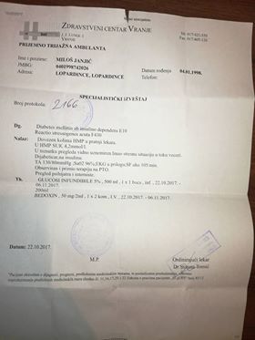 BUJANOVAC, 24. oktobar 2017. – Bili smo porodično na svadbi u Stakleniku, kada mi je pao šećer, a pošto sam dijabetičar nije mi bilo dobro i morali smo da krenemo.