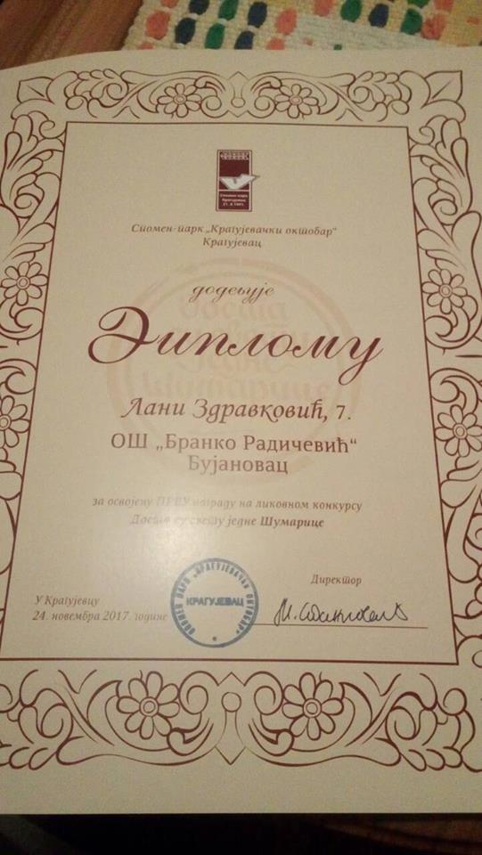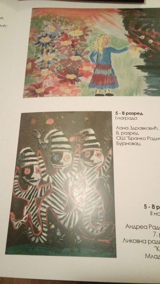 BUJANOVAC, 26. novembar 2017. (Foto FB)- Učenica 7. razreda Osnovne škole „Branko Radičević“ iz Bujanovca Lana Zdravković, osvojila je prvu nagradu na likovnom konkursu „Dosta su svetu jedne Šumarice“, kojeg je za osnovce i srednjoškolce raspisao Spomen park „Kragujevački oktobar“ iz Kragujevca.