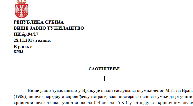 Po predlogu Višeg javnog tužilaštva u Vranju , sudija za predhodni postupak Višeg suda u Vranju je osumnjičenom odredio pritvor u trajanju do 30 dana, a u postupku dalje istrage preduzeće se i druge dokazne dokazne radnje i izvršiti neophodna veštačenja, saopštava VJT.
