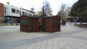 Na suprotnoj strani trga, u neposrednoj blizini fontane kod zgrade opštine, postavljene su dve drvene barake, a ispred njih niz sijalica.