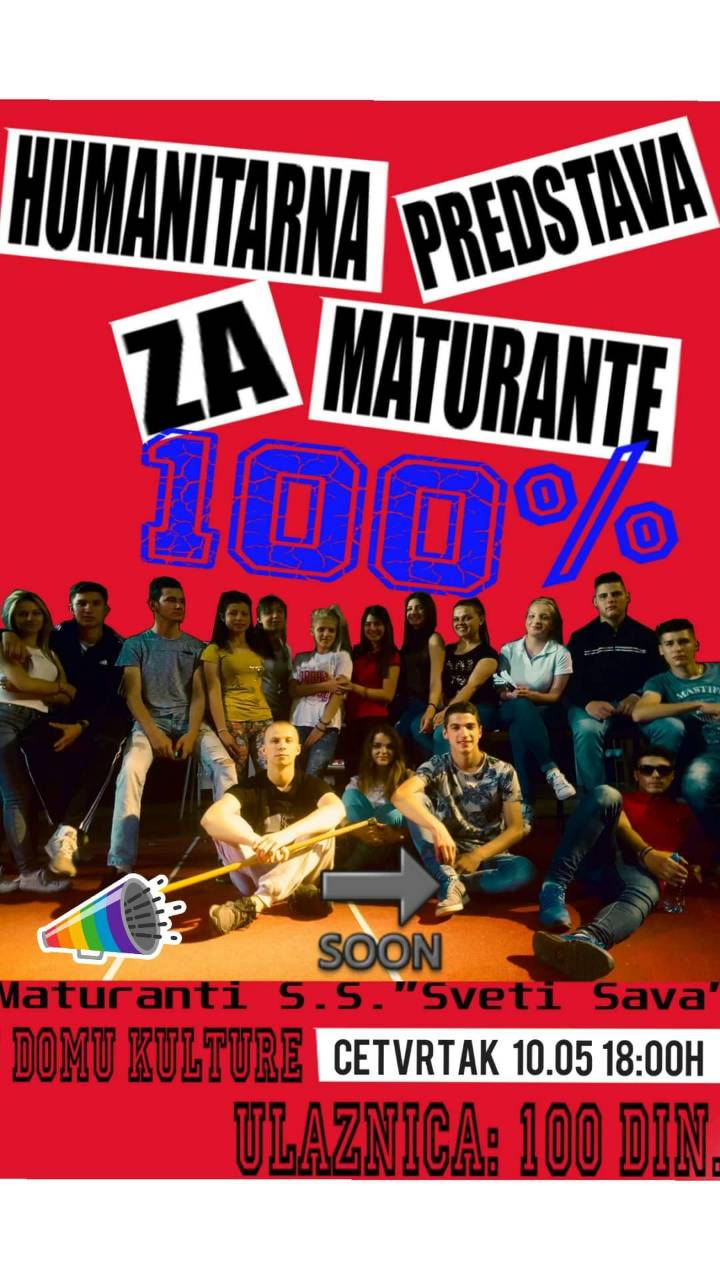 BUJANOVAC, 8. maj 2018. Grupa maturanata  bujanovačke Stručne škole „Sveti Sava“, koji poseduju glumačke sklonosti, u četvrtak će u velikoj sali Doma kulture „Vuk Karadžić“ u Bujanovcu  premijerno odigrati humanitarnu pozorišnu predstavu „Sto posto“.