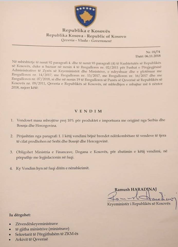 Kosovska vlada donela je odluku o “uspostavljanju zaštitnih mera za proizvode koji dolaze iz Srbije”.