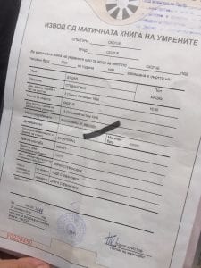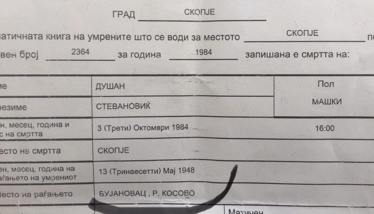 I, zaista, na originalnom dokumentu, “Izvod iz matičnata kniga na umrenite”, koji i vi vidite, a koji je izdao “Grad Skopje, Opština Skopje”, piše da je pokojni Dušan 13. maja 1948. godine rođen u Bujanovcu, u Republici Kosovo.