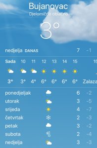 Jutarnja temperatura od 1 do 4 stepena Celzijusa, a maksimalna dnevna do 6 stepeni.