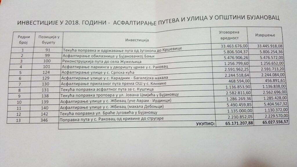 Među navedenim stavkama je i asfaltiranje obilaznice u Bujanovačkoj banji sa 5,8 miliona, asfaltiranje ulice u mahali Debonjci u Žbevcu vredno 5,49 miliona i rekonstrukcija puta do sela Žuželjica, koja je koštala 5,47 miliona dinara.