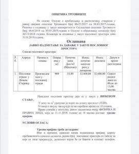 Opštinska uprava Trgovišta, dodaju, 31.10.2019. godine raspisala je oglas o javnom nadmetanju fizičkih i pravnih lica o ustupanju u zakup poslovnog prostora u Donjem Stajevcu na 10 godina, za mesečnu kiriju od 32.000 dinara.