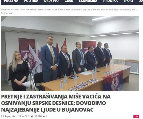 “Već tokom osnivanja, od njenog predsednika Miše Vacića čule su se pretnje upućene neistomišljenicima, podele na navodne i prave Srbe, a nisu izostali ni stari, ali nezaboravljeni termini kukolj, domaći izdajnici i raseljavanje. Srpska desnica je, podsećamo, ušla u institucije nekoliko lokalnih samouprava na jugu Srbije: Deo je lokalne vlasti u Vranju i Niškoj Banji, kao i SO Medveđa. Stranačke odbore na jugu je, osim u Bujanovcu, formirala i u Lebanu, Bojniku i Svrljigu i niškim opštinama Pantelej, Medijana i Crveni krst”, kažu u NKD koja tribinu organizuje zajedno sa portalima Južne vesti i Bujanovačke.