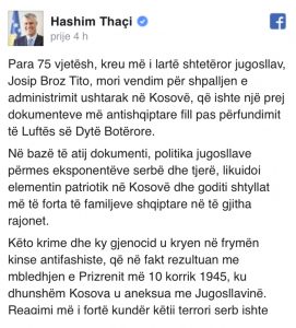 “Ti zločini i genocid izvršeni su pod izgovorom antifasisticke borbe, što je rezultiralo nasilnom aneksijom Kosova.
