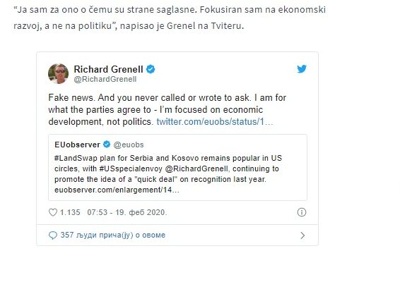 “To su lažne vesti”, napisao je Grenel na svom Tviter nalogu komentarišući članak koji je u utorak objavljen na Euobserver- u a u sredu ga prenele i Bujanovačke.
