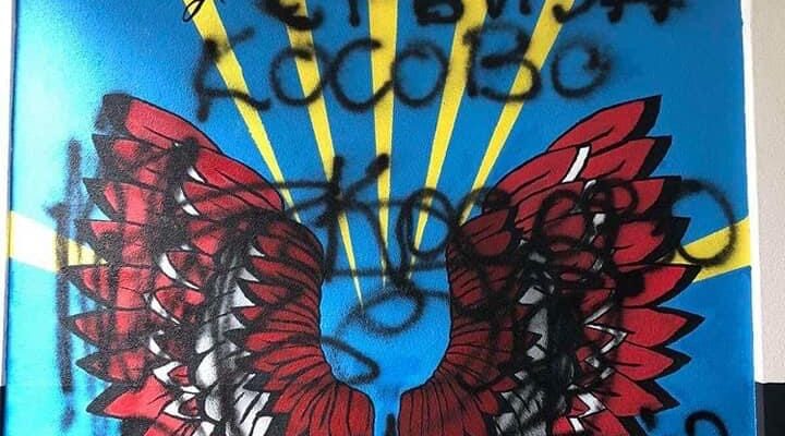 Mural, koji su đaci i nastavnici naslikali u znak zahvalnosti Albaniji i Kosovu zbog toga što albanski đaci prvi put posle dve decenije imaju udžbenike na maternjem jeziku, išaran je natpisima “Kosovo je Srbija”.