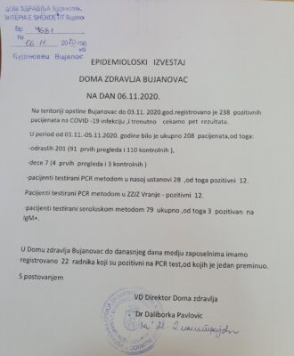 Bujanovac, 6. novembar 2020. Prema najnovijim podacima koje su Bujanovačke dobile iz Doma zdravlja od početka novembra pa do danas u Bujanovcu je registrovano 27 novoobolelih od kovida-19.