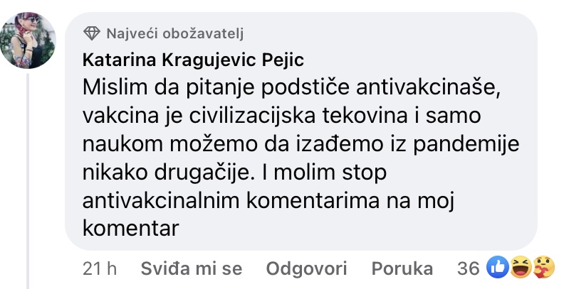 Dr Katarina Kragujević Pejić je konstatovala da pitanje podstiče antivakcinaše, te da je vakcina civilizacijska tekovina i da samo naukom možemo da izađemo iz pandemije.