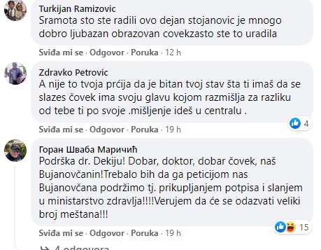 Da se cene stručnost i ljudski kvaliteti dr Stojanović, bi bio postavljen za direktora Doma zdravlja, a ne smenjivan sa mesta načelnika, poručuju i Srbi, i Albanci i Romi u nekoliko stotina komentara na Fejsbuk stranici našeg portala.