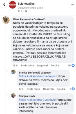 „Neću se vakcinisati jer te teraju da se potpišeš da primašvakcinu na sopstvenu odgovornost…Navodno naš predsednik cenjeni ALEKSANDAR VUČIĆ ne tera nikog na silu da se vakciniše, a sa druge strane dolaze naredbe u firmama da se otpuste oni koji se ne vakcinišu. Vozači koji se ne vakcinišu uskoro neće moći da prelaze granicu…Tretiraju nas kao labaratorijske miševe…OVAJ BEZOBRAZLUK PRELAZI GRANICU!“, kaže jedan čitaoc.
