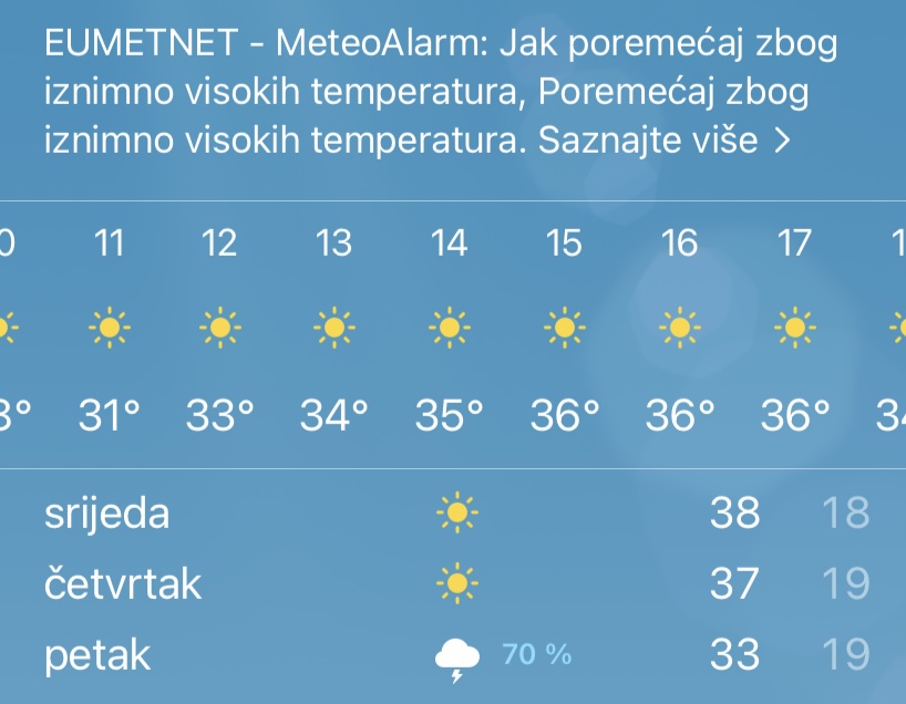 Za danas je prognozirano 36 stepeni, a od petka pa cele naredne nedelje temperatura će se kretati između 28-32 stepena C.