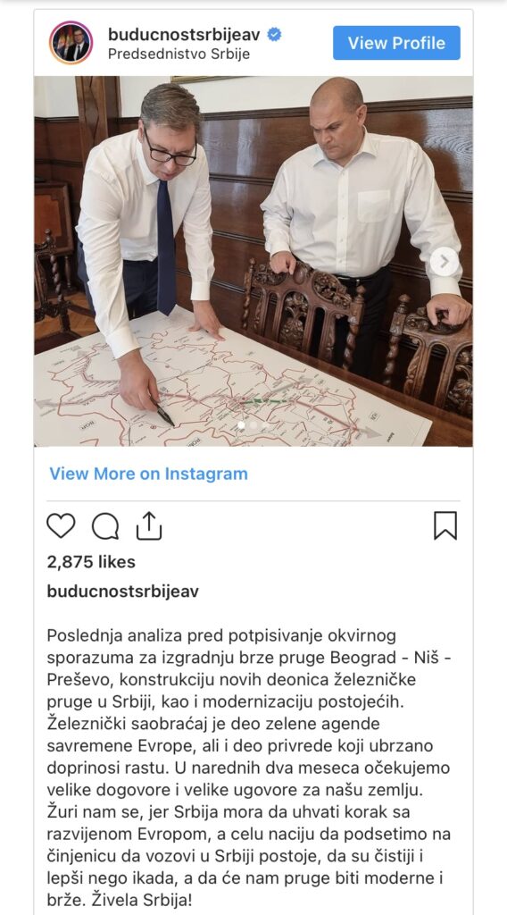 “Poslednja analiza pred potpisivanje okvirnog sporazuma za izgradnju brze pruge Beograd – Niš – Preševo, konstrukciju novih deonica železničke pruge u Srbiji, kao i modernizaciju postojećih”, napisao je Vučić na Instagram nalogu “budućnostsrbijeav”.