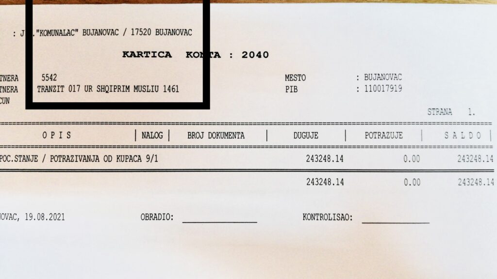 Bujanovac, 20. Avgust 2021. – Zamenik predsednika opštine Bujanovac Šćiprim Musliju, za kafić u Domu kulture, gde se priključak vodi na njegovo ime, Komunalcu na ime usluga duguje 243.248 dinara zaključno sa decembrom 2020. godine,  pokazuju „kartica konta“ ovog javnog preduzeća broj 2040 do koje su došle Bujanovačke.