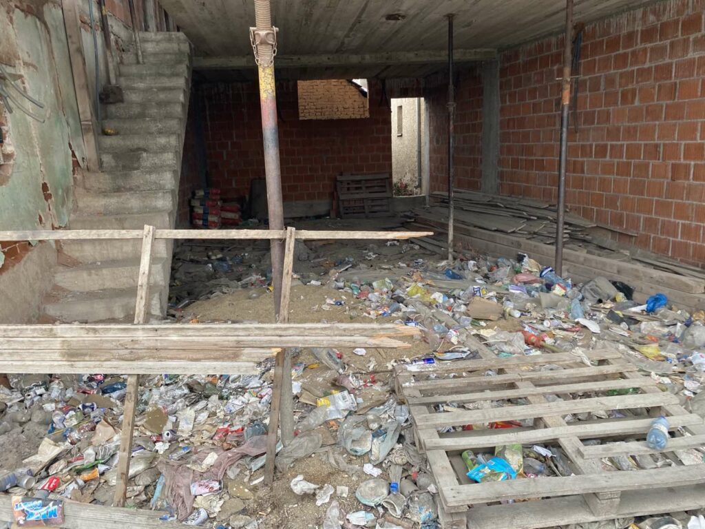 Bujanovac, 31. januar 2022. – Objekat pored Poštanske štedionice već tri godine stoji nedovršen i predstavlja ruglo u samom centru Bujanovca. Neobezbeđena građevina, unutar koje je gomila bačenog smeća, prizor je na koji građani koji čekaju u redu ispred banke, ali i prolaznici, svakodnevno nailaze.