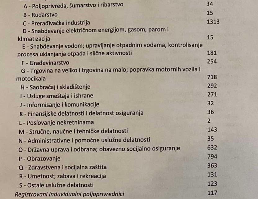 Po broju zaposlenih po oblastima u privatnom sektoru ubedljivo najviše radnika ima prerađivačka industrija, a slede trgovina sa 718, saobraćaj i skladištenje – 292, usluge smeštaja i ishrane – 271 i građevinarstvo sa 254 radnika.