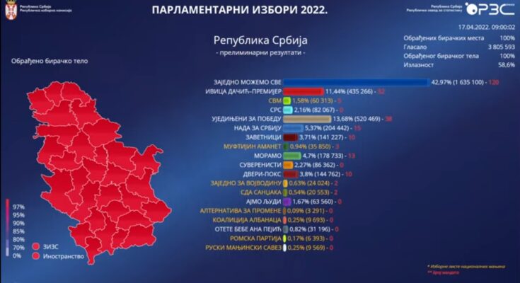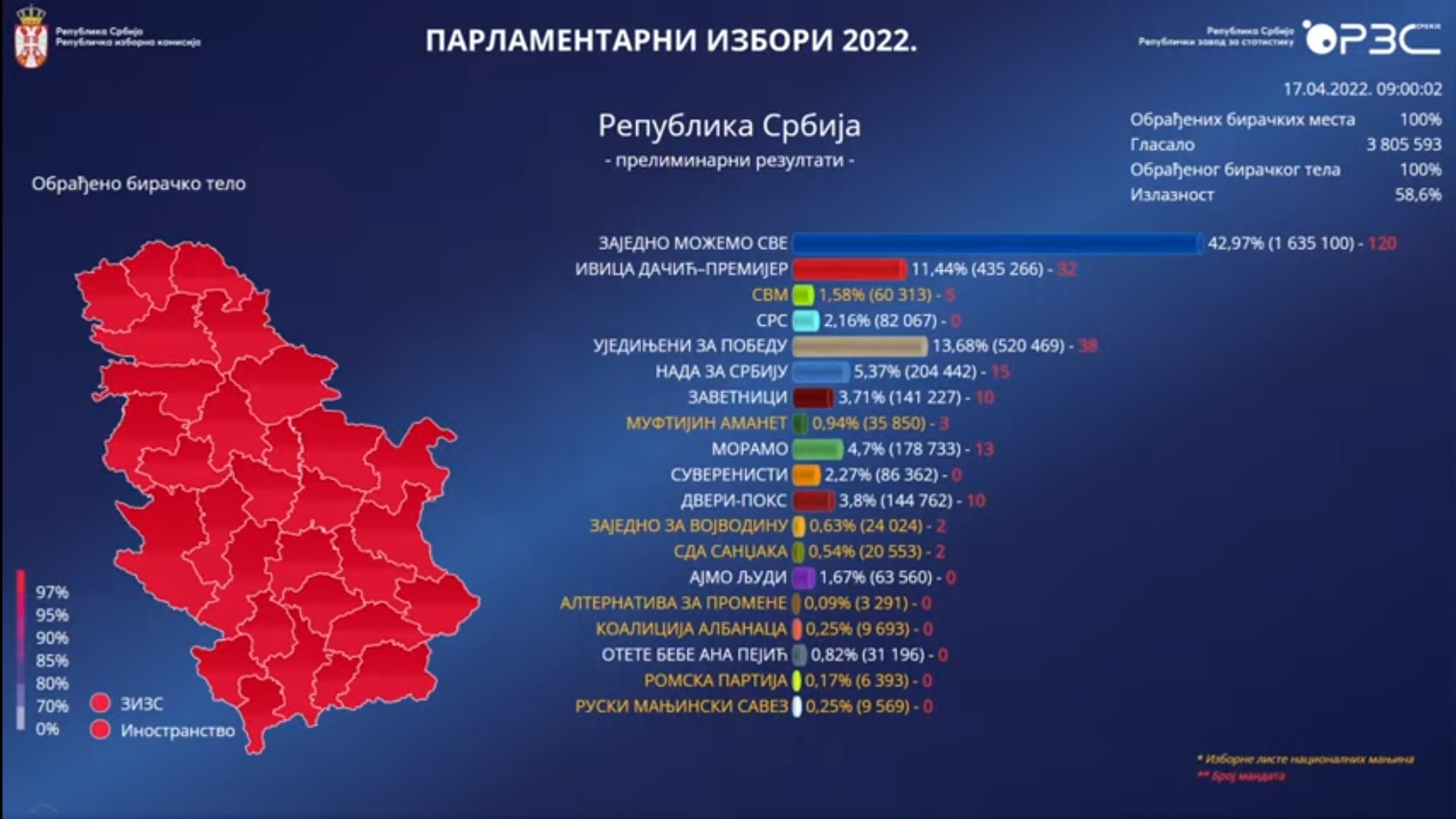 Iz Srpske napredne stranke (SNS) saopšteno je da je na ponovljenim parlamentarnim izborima ova stranka osvojila 60,94 odsto glasova, u odnosu na 43,6, koliko je osvojila 3. aprila, dok je lista Ujedinjeni za pobedu Srbije osvojila 5,92 odsto, u odnosu na 13 procenata koliko je imala 3. aprila.