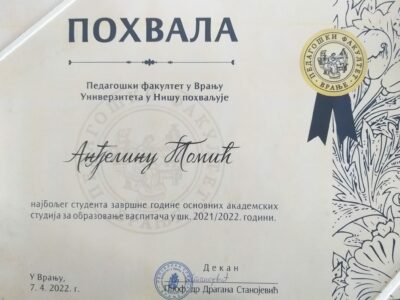 Bujanovac, 8. jul 2022. – Anđelina Tomić iz Božinjevca proglašena je za najboljeg studenta završne godine osnovnih akademskih studija za obrazovanje vaspitača na vranjskom Pedagoškom fakultetu Univerziteta u Nišu.