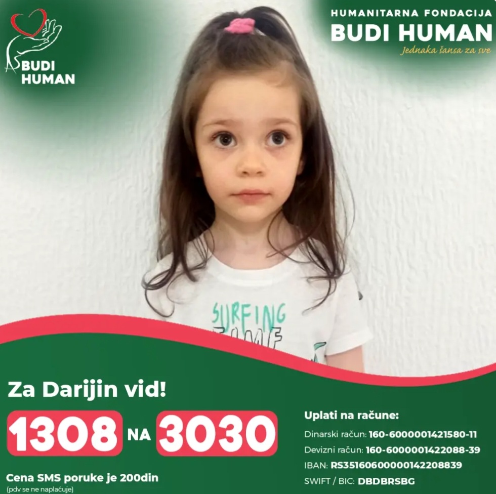 Maloj Dariji možemo pomoći slanjem sms poruke 1308 na broj 3030, ali i uplatom novca na dinarski račun 160-6000001421580-11 i devizni: 160-6000001422088-39 IBAN:RS35160600000142208839, SWIFT/BC: DBDBRSBG