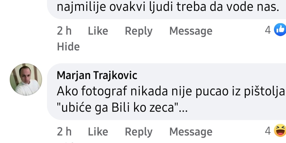 Bujanovac, 18. novembar 2022. Tekst o nelegalnom skladištu ogrevnog drveta na putu prema školi u selu Klinovac kod Bujanovca izazvao je lavinu komentara na Fejsbuk stranici našeg portala, među kojima ima i onih koji se mogu shvatiti kao otvorena pretnja. Jedan od takvih je i komentar advokata Marjana Trajkovića iz Klinovca, sa kancelarijom u Bujanovcu, koji je čitaocu koji nam je poslao fotografiju sa lica mesta poručio: Ako fotograf nikada nije pucao iz pištolja „ubiće ga Bili kao zeca“.