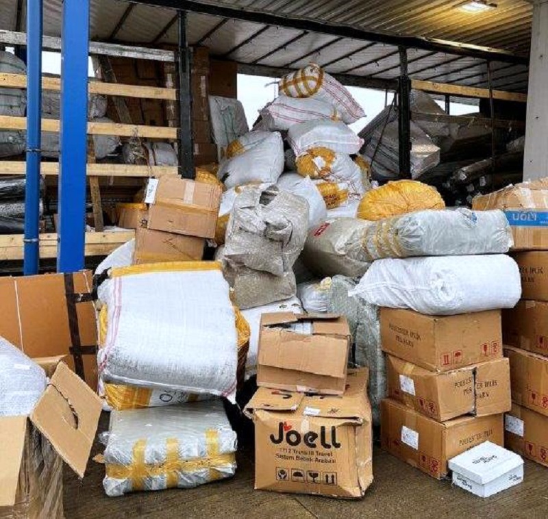 Bujanovac, 26. januar 2023. (foto Uprava carina) – Na graničnom prelazu Preševo sprečen je šverc preko dve tone garderobe, auto delova, parfema i druge robe.
