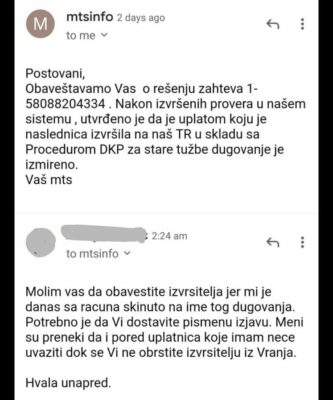 Bujanovac, 14. februar 2023. Bujanovčanki M.B. MTS šalje izvršioce zbog neplaćenog računa za telefon pokojne majke od 3.500 dinara, koji je platila još 2020. godine. Njihovom greškom uplata je otišla na drugi račun, a iako su joj u MTS rekli da više ne duguje, sada joj od plate skidaju novac na ime tog dugovanja. Očajna Bujanovčanka najavljuje tužbu jer, kako kaže, više ne može da trpi njihovu neprofesionalnost i bezobrazluk.
