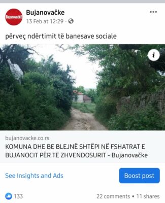 Bujanovac, 18. februar 2023. Albanci se žestoko protive izgradnji stanova i kupovini kuća za Rome koji su 1999. godine u Bujanovac izbegli sa Kosova, sudeći po komentarima na FB stranici našeg portala. Optužuju Evropsku uniju (EU) da finansira etničko čišćenje Albanaca u opštini Bujanovac.