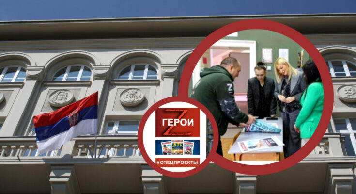 Bujanovac, Vranje, 16. mart 2023. (foto Slobodna reč) – Sa istaknutim belim „Z“ na desnom rukavu jakne sa maskirnim motivima, Vjačeslav Vjačeslavovič Kalinin, urednik „Veteranskih vesti“, glasila sa kojim sarađuje rusko Ministarstvo odbrane, delio je upravi vranjske Gimnazije i članovima đačkog parlamenta primerke ovog časopisa i fotografisao se sa njima dok su svi zajedno držali zastavu sa logotipom ovog medija, piše Slobodna reč.