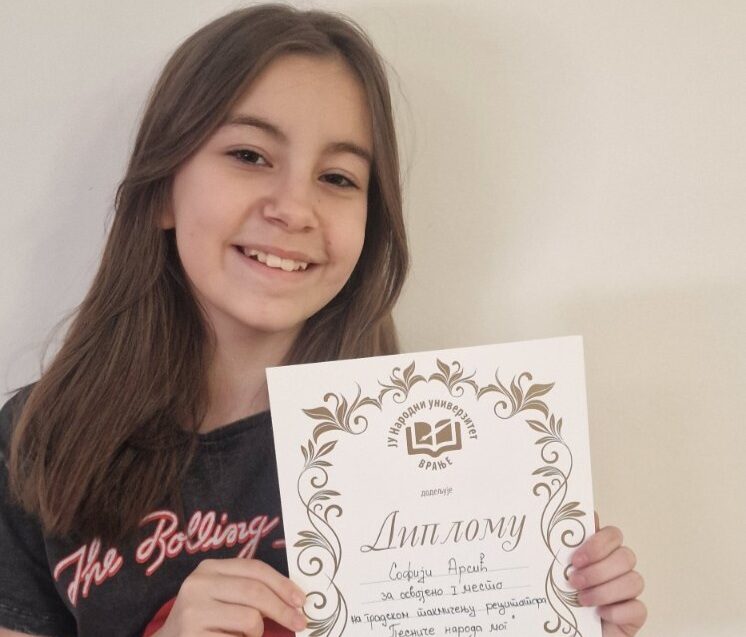 Bujanovac, 17. mart 2023. Bujanovčanka Sofija Arsić, učenica petog razreda OŠ “Radoje Domanović” u Vranju osvojila je prvo mesto na gradskom takmičenju u recitovanju “Pesniče naroda mog”, održanom u petak u vranjskoj Gimnaziji Bora Stanković.