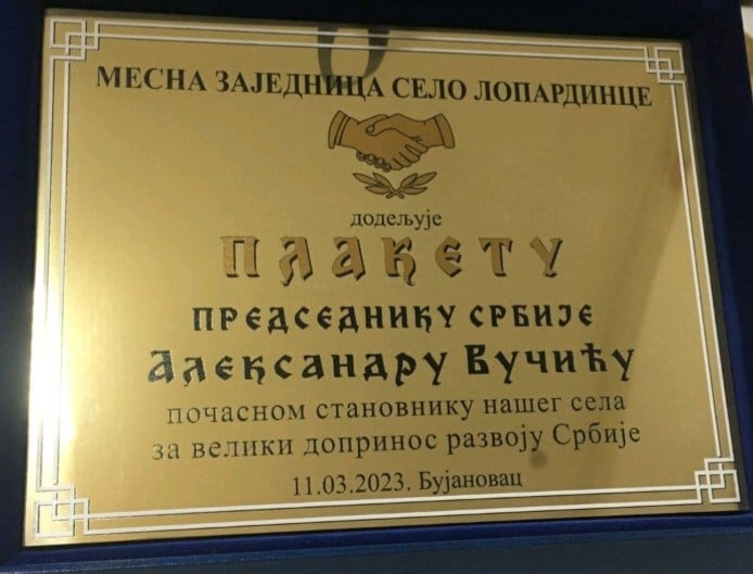 Bujanovac, 23. mart 2023. Predsednik Srbije Aleksandar Vučić proglašen je za počasnog stanovnika sela Lopardince kod Bujanovca. Vučiću je plaketu dodelila mesna zajednica ovog sela 11. marta kada je posetio Bujanovac i uručena mu je preko šefa njegovog kabineta.
