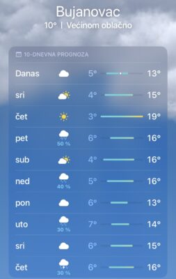 Bujanovac, 11. april 2023. (Foto arhiva) – Za Uskrs Bujanovčane sa 16 stepeni očekuje nešto toplije vreme nego proteklih dana, ali meteorolozi za nedelju 16. aprila predviđaju kišu, a slično vreme očekuje se tokom svih prazničnih dana. Sunčano vreme do 19 stepeni, bez oblaka i kiše, moguće je u četvrtak, a nakon toga sledi povratak na jesenje vreme.
