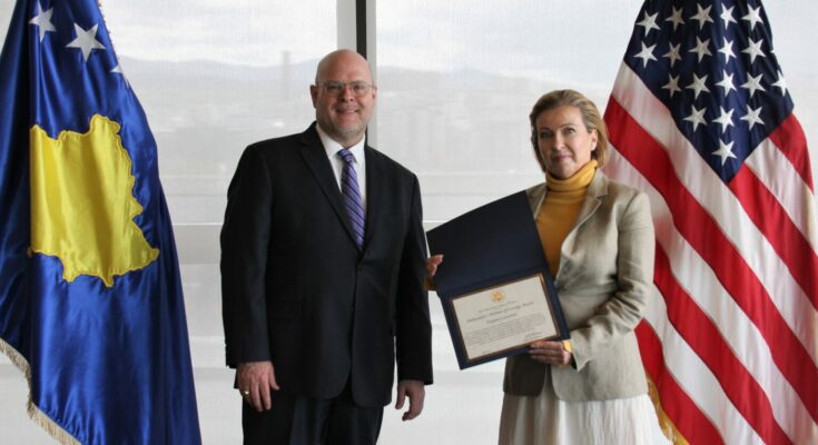 Bujanovac, Priština, 19. april 2023. (Foto: Ambasada SAD u Prištini) – Tatjana Lazarević, urednica KoSSev portala, , dobitnica je nagrade za hrabrost. Priznanje joj je uručio ambasador Sjedinjenih američkih država u Prištini, Džefri Hovenijer, piše Kossev.